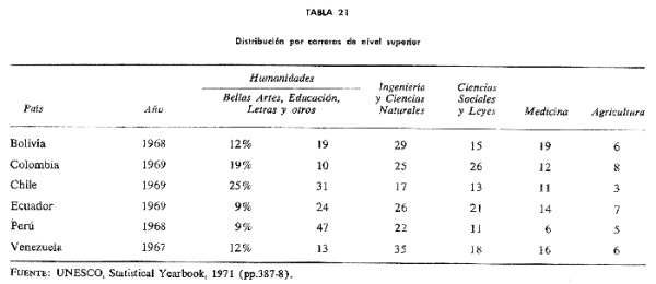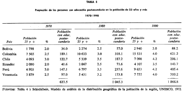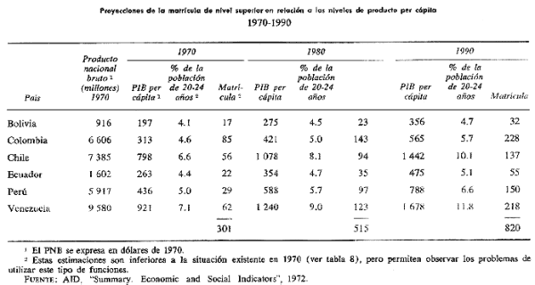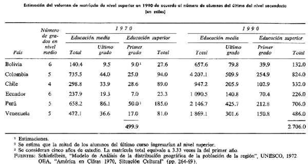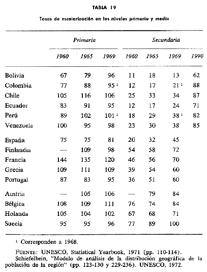 andina en ciertos niveles generales de desarrollo de los sistemas educacionales al comienzo de la década