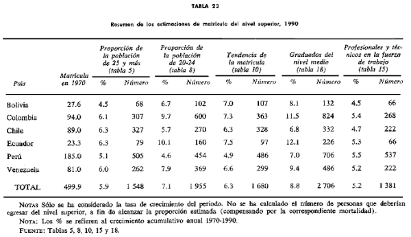 de matrícula. En la tabla 23 se presentan las cinco estimaciones hechas para los países del área