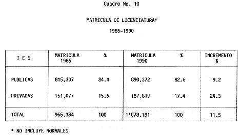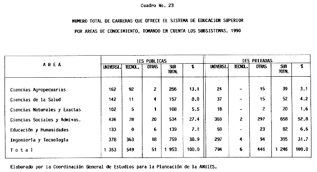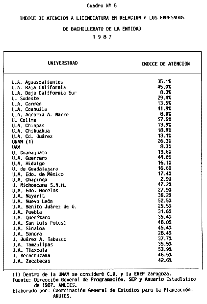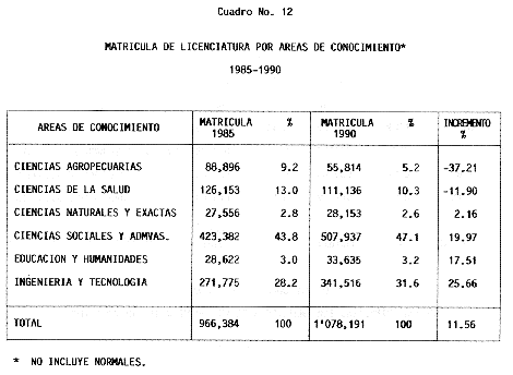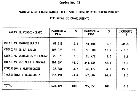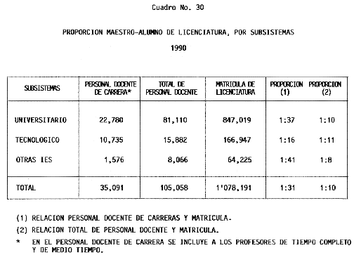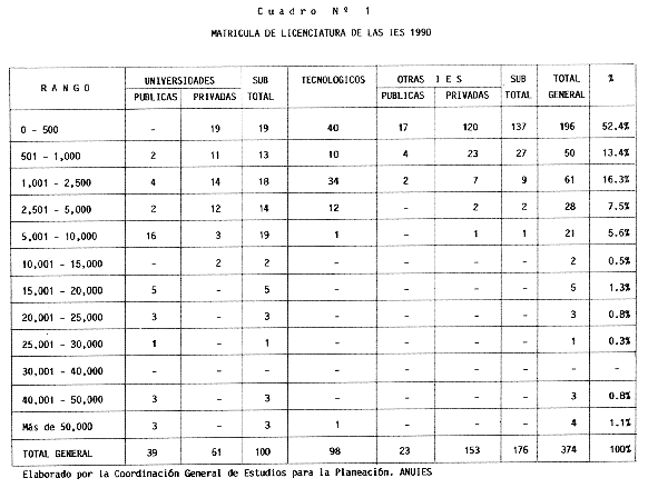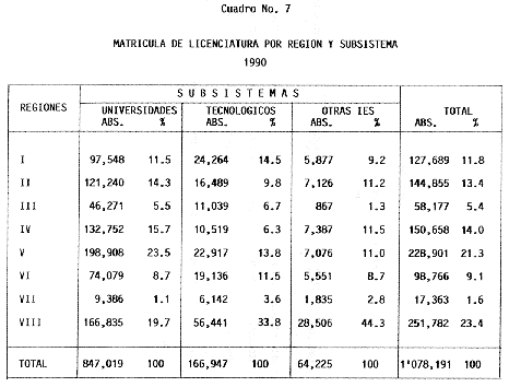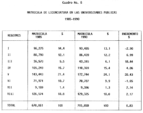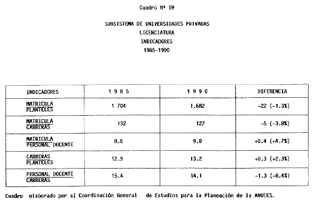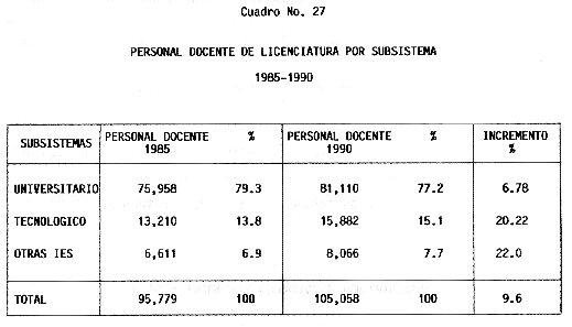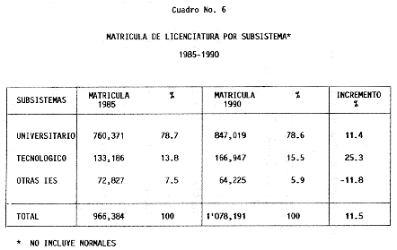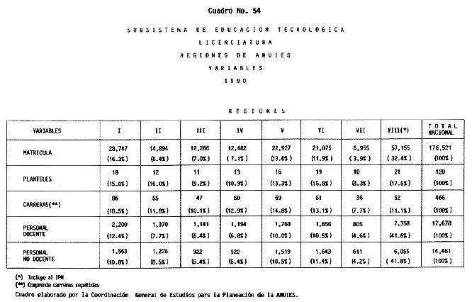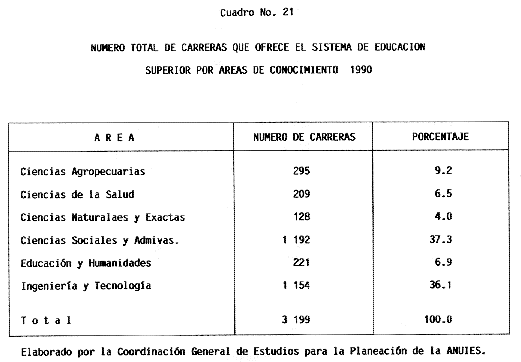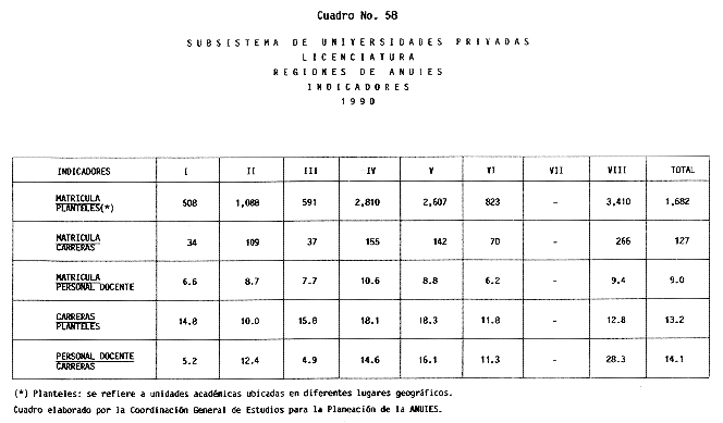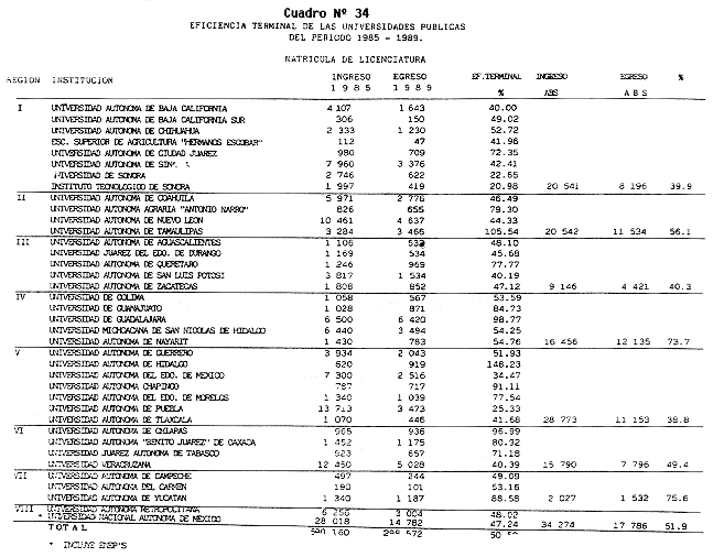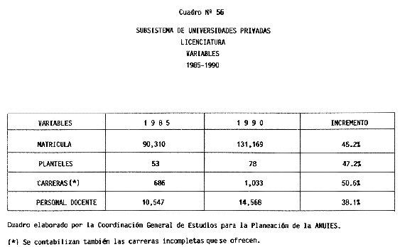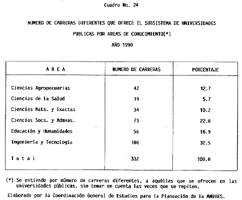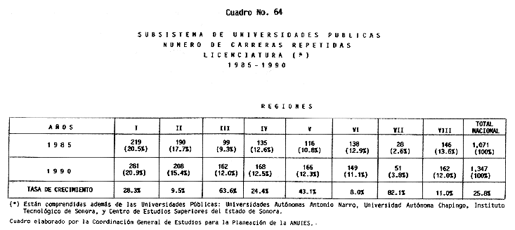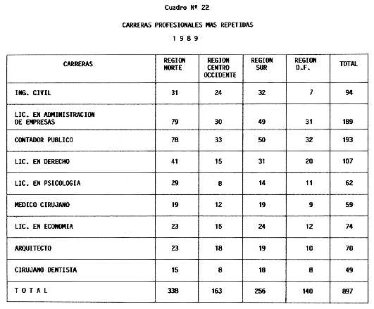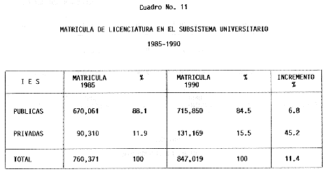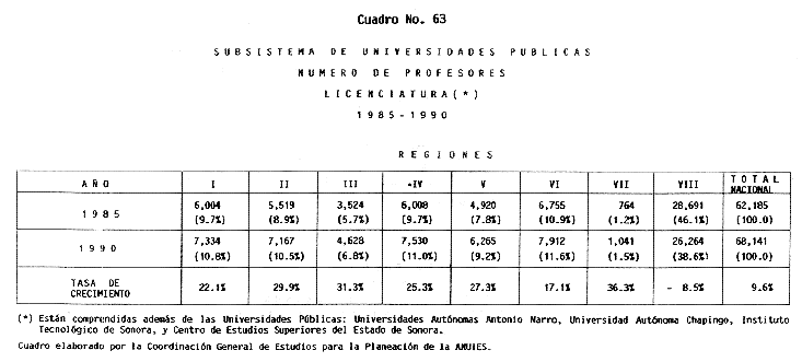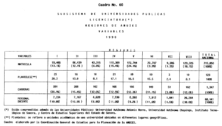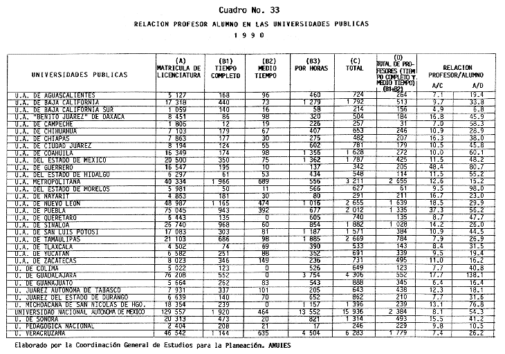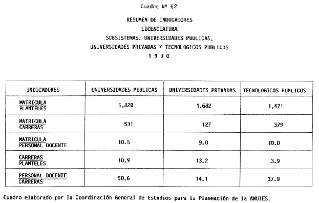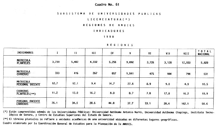 Nota: Varios de los cuadros presentados tiene como fuente el documento: "Evaluación Preliminar del Subsistema Universitario (1990)", Dirección de Desarrollo Universitario, Dirección General de Educación Superior, SESIC-SEP.